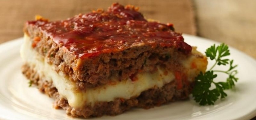 ادهني صينية بالزيت ووزعي نصف خليط اللحم في الصينية ثم وزعي خليط البطاطس، واخيراً وزعي باقي خليط اللحم ثم الكاتشب.